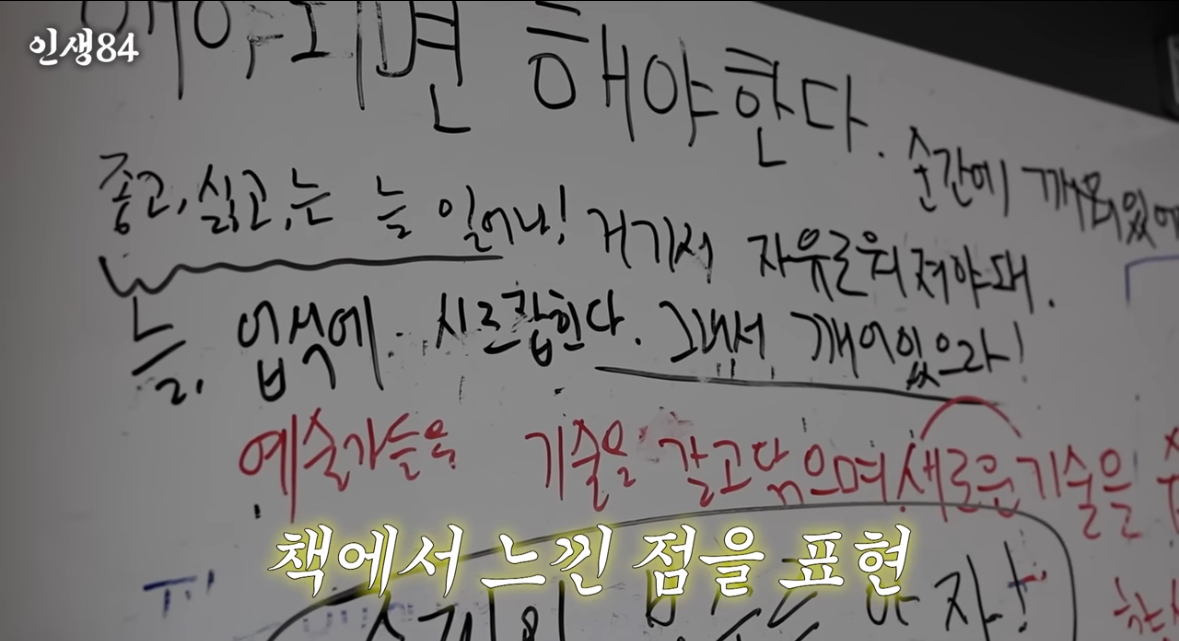아마도 그녀는 문득 든 생각을 놓치지 않기 위해, 당장 눈에 보이는 곳으로 달려가 글씨를 적었을 거예요. 예쁜 종이를 찾아, 예쁘게 글씨를 적는 것보다 더 중요한 건 그 생각을 놓치지 않고 잘 보이는 곳에 적는 것이었겠죠. 기안84가 책을 좋아하는 그녀에게 책을 추천해 달라고 하자, 그녀는 <내가 틀릴 수도 있습니다>라는 책을 고른 뒤 손가락으로 냉장고를 가리켰습니다. 이미 그 책에서 발췌한 최고의 문장을 냉장고에 적어두었고, 매일 냉장고를 열 때마다 그 문구를 읽은 것입니다.