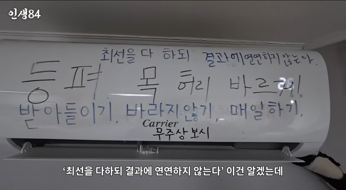 배우 이세희 씨 집의 에어컨, 냉장고, 독서대, 텀블러 등 물건 곳곳에는 휘갈겨 쓴 글씨들이 있습니다. '등펴, 목 허리, 바르게'와 같이 생활 습관을 되돌아보게 하는 문구라든지, '최선을 다하되 결과에 연연하지 않는다' 등 자신이 추구하는 인생의 태도에 대한 내용이죠. 예쁜 종이에 글씨를 써서 벽에 붙이거나, 줄을 맞추어 글씨를 쓸 법도 한데 메모가 너무 자유분방해서(?) 놀랐어요.