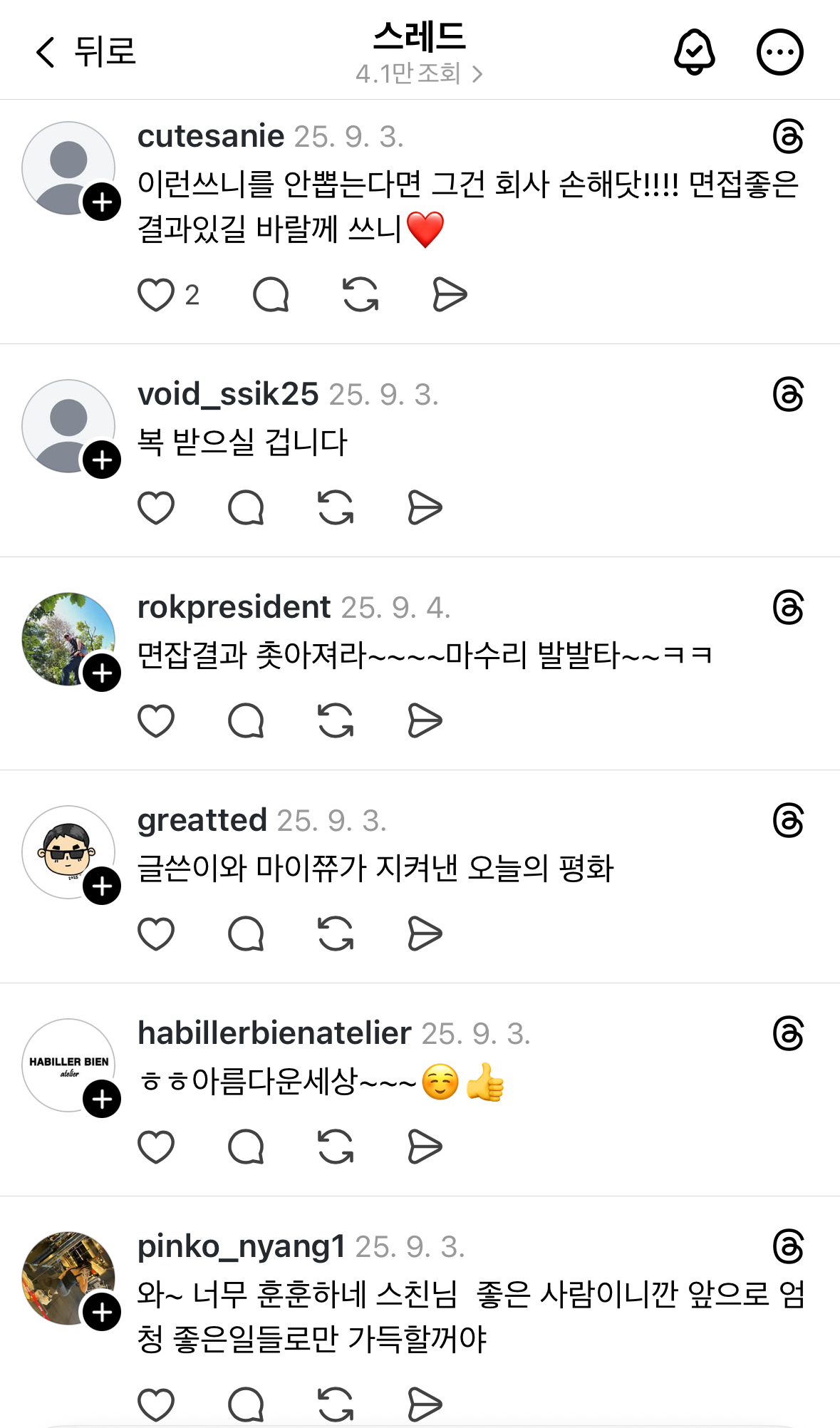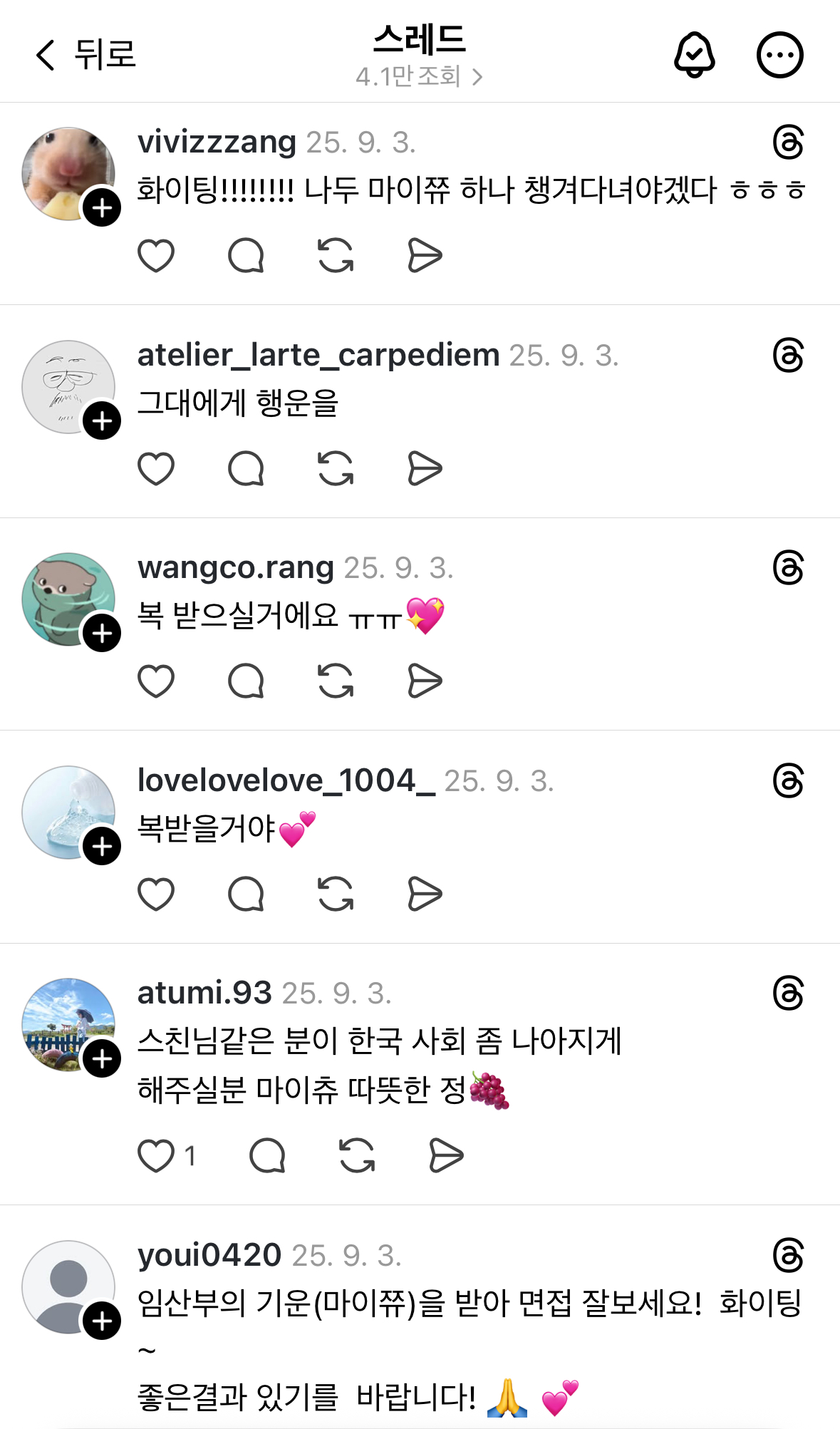 역 플랫폼에서 마이쮸를 손에 올려놓고 사진을 찍었어요. 사진과 함께 방금 있었던 일을 스레드에 적고, 마이쮸를 행복의 묘약 삼키듯 삼키곤 면접장으로 향했습니다. 약 1시간 뒤, 면접을 마치고 나와 집에 가는 길에 스레드를 열고는 깜짝 놀랐습니다. 조회수 4.1만, 좋아요 2,820개, 그리고 약 70여 명이 저의 면접을 응원하는 댓글을 달아주신 겁니다. |